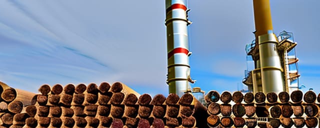 timber piled up next to a refinery
